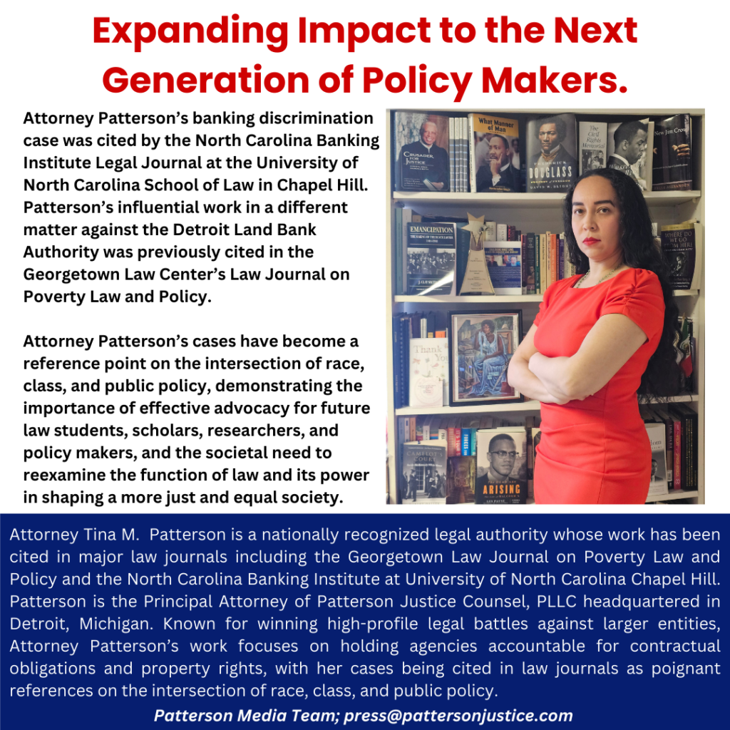 Attorney Patterson’s influential case against the Detroit Land Bank Authority continues to have impact and underscores how economic justice issues in Detroit are being closely monitored from around the country. The case became a reference point on the intersection of race, class, and public policy in the premier Georgetown Journal on Poverty Law and Policy, published by Georgetown Law, one of the nation’s most preeminent institutions of legal education, demonstrating the importance of effective advocacy for future law students, scholars and researchers interested in public interest law.